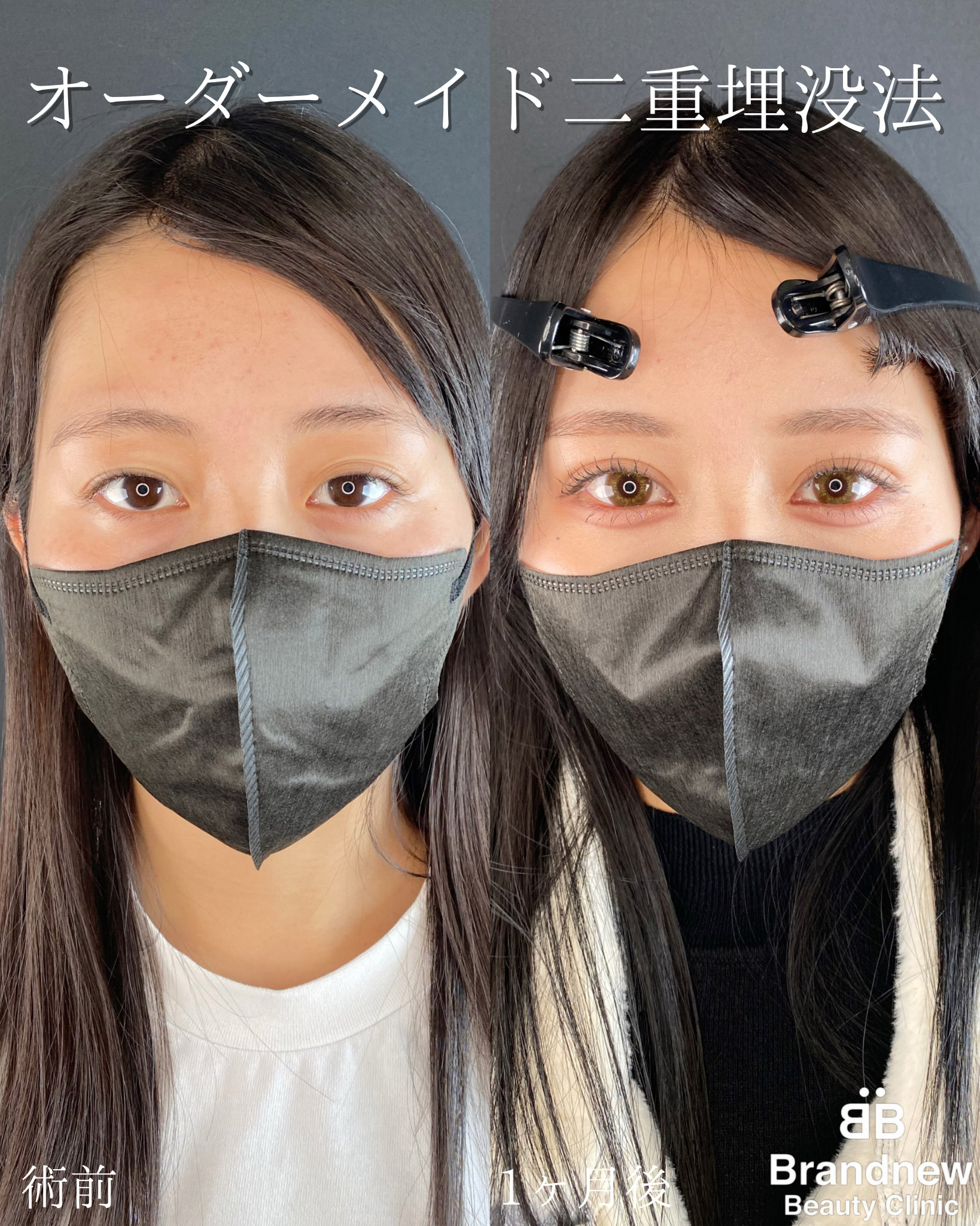 元々のラインから自然に広げる形でデザインしています。形としては中間型〜狭めの平行型にあたります。AFTER写真は術後1ヶ月です。線留め(自然癒着法)は4点、6点、裏留めの3通りの方法がありますが、4点線留めの方が直後から完成形に近い自然な線になりやすく、6点線留めはよりくっきりした線が欲しい方や広い幅にしたい方におすすめです。