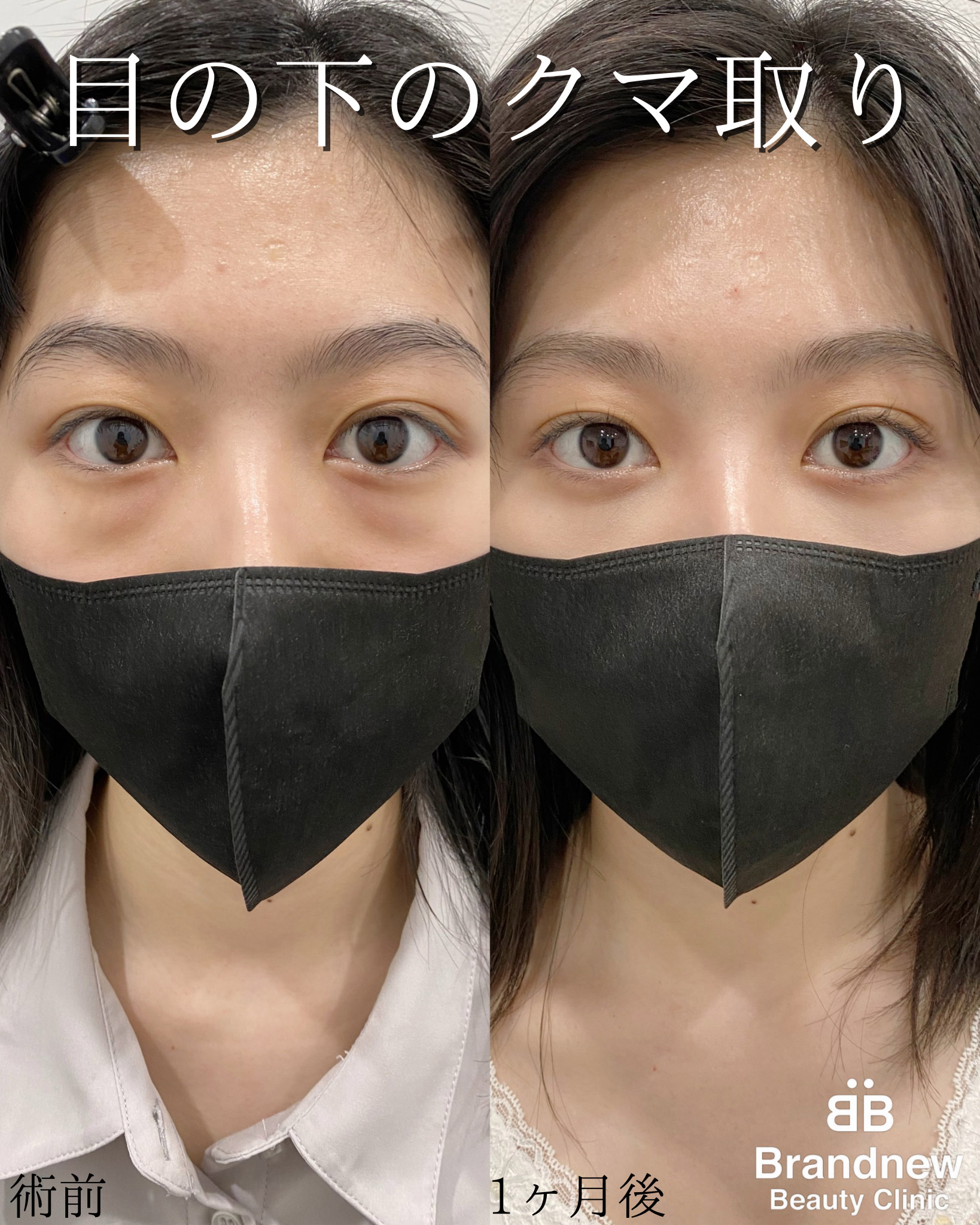 目の下の脂肪の袋を左右3つずつ除去しクマを改善しています。脂肪を除去することで膨らみがよくなり目元の印象が良くなります。青紫の色味(青クマ)は脂肪の除去で無くなるわけではありませんが、膨らみが改善することで色味も施術前より改善して見えるケースもあります。