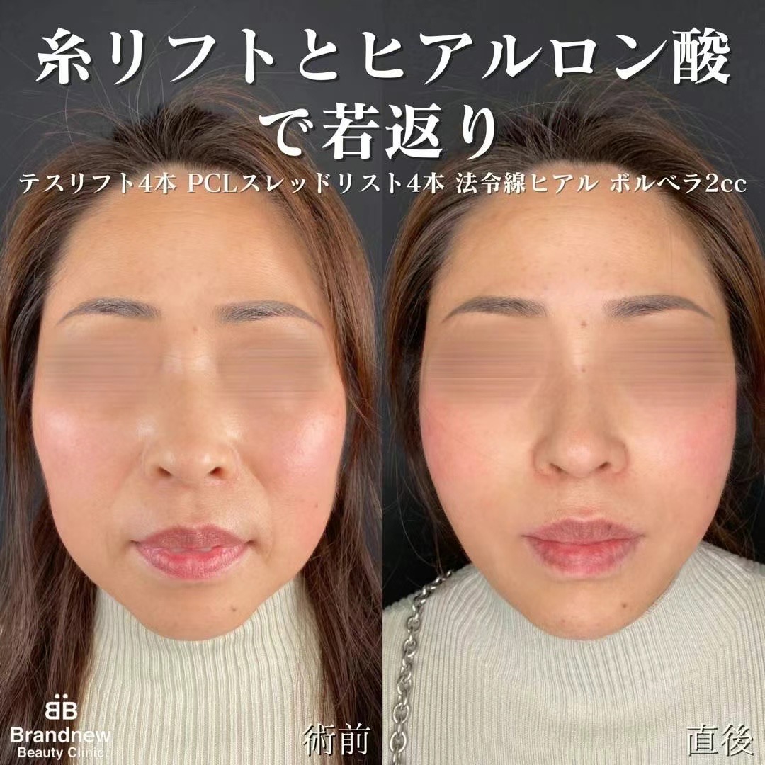 ほうれい線〜フェイスラインにかけて片側3本ずつ糸を入れリフトアップしています。持続力が高くタイトニング(引き締め)効果の高いテスリフトと、リーズナブルながらしっかりとリフト効果が出るPCLスレッド。本例のように組み合わせて使用し、効果と価格のバランスをとるのもおすすめです。